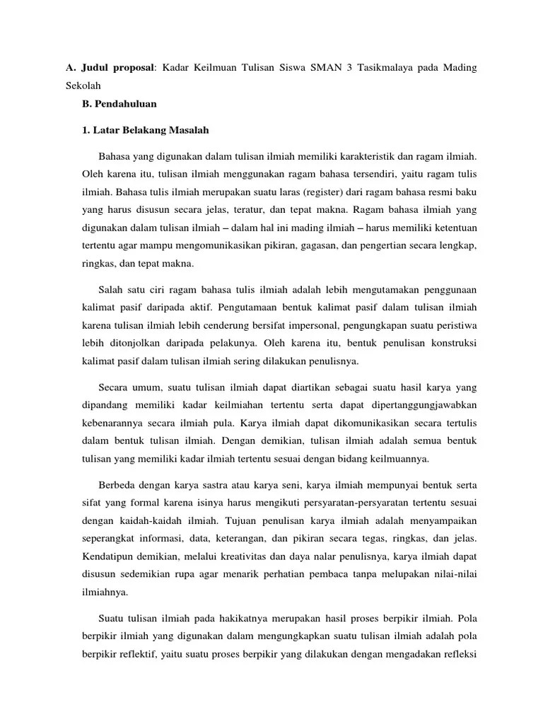 Penelitian dengan judul kadar keilmuan tulisan siswa sman 3 tasikmalaya pada majalah dinding mading sekolah penting. Pertanyaan yang belum terjawab akan segera mendapatkan ulasan dan pembahasan dari pengunjung lainnya, atau dari tim p Merancang sebuah proposal karya ilmiah dengan memperhatikan informasi, tujuan, dan esensi karya ilmiah setelah mempelajari materi ini, kamu diharapkan mampu: Silahkan baca pembahasan dan jawaban atas pertanyaan carilah sebuah proposal penelitian,identifikasi lah fitur fitur kebahasaan yang menandai proposal tersebut di bawah ini. Academia.edu is a platform for academics to share research papers.